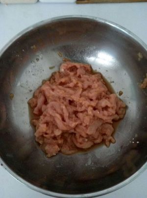 腌制:里脊肉切丝后加入生抽5g、老抽5g、盐1小勺、白胡椒粉1小勺,腌制10分钟,结束加入2大勺淀粉、10g混合,加入肉馅中顺时针搅拌均匀,再静置5分钟