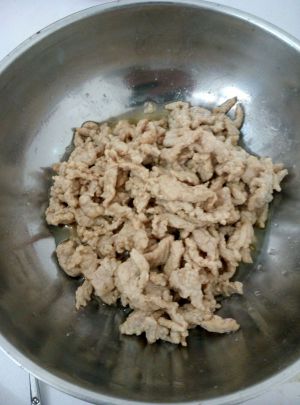 猪里脊,切粗细适中的丝。锅内清水烧沸,把肉丝焯水。变色即熟,不要把肉焯老。