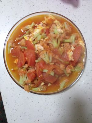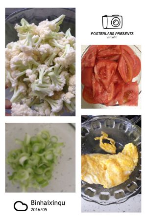 准备工作:番茄切块 鸡蛋炒熟 葱切段 菜花分开下水焯熟捞出