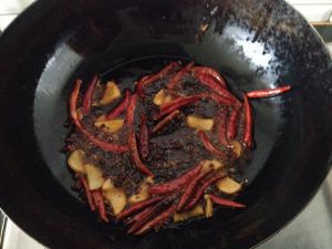 下油,不要烧热,就下底料,辣椒,花椒和姜片,炒香