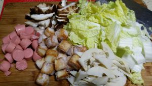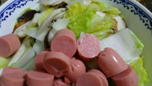 将食材在开水锅中烫熟,鱼豆腐熟的慢便最先放入,其次是香菇,笋片,娃娃菜,牛肉肠已是可直接食用的则无需烫熟