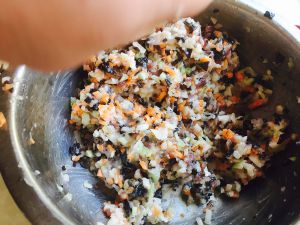 将粘米粉,糯米粉,面粉按比例混合,加少许盐,磕入鸡蛋,加冷开水,搅拌成糊状。 加入切好的蔬菜。拌匀。静置待用。(要求面糊里无颗粒状)