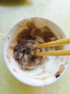加少许盐(这样才能上劲哦),摔打开始粘稠之后,顺时针搅动,等碗倒置不会掉就可以了;