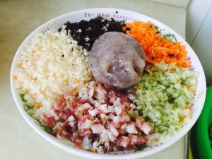 鲜虾去壳去虾线,将虾仁,西红柿,青菜叶尽量切碎放进大碗;