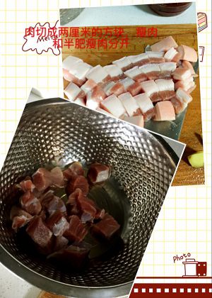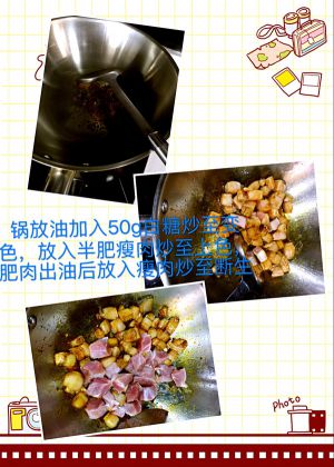 炒锅放油,把适量冰糖放进去,小火慢慢炒着,直到糖化掉,把肉倒进去继续翻炒,看到肉变的有点颜色了,就可以出锅备用了(这样炒过的肉脂肪会减少,口感,颜色也会更好俗称这叫“炒糖色”)