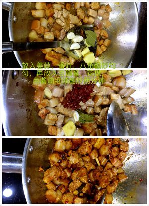 待肉块颜色均匀,煸炒出油,放少量料酒,放入调料,还可以再放一些腐乳汁,酱油,继续翻炒片刻,颜色口味更佳。