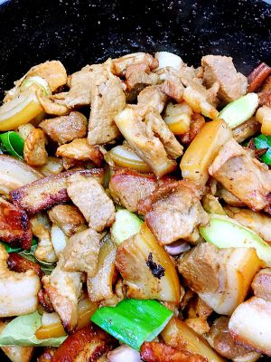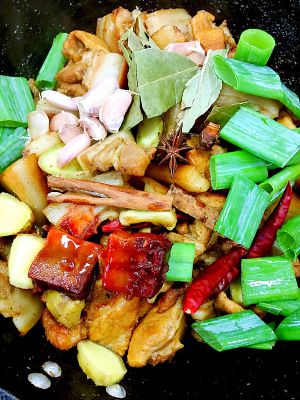 煸炒至五花肉片微微出油后加入姜片和大料、冰糖一起进去翻炒;