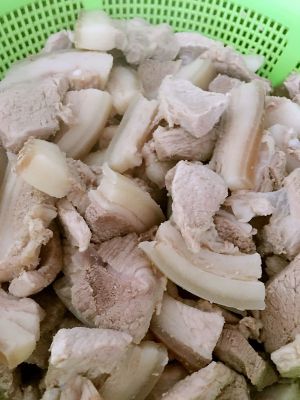 把五花肉清洗干净,上锅煮个20~30分钟左右,拿出,准备一把专用的刮毛刀,当然,是专刮猪毛的哦,把猪皮上的毛来来回回的刮干净,再次清洗干净切块备用。