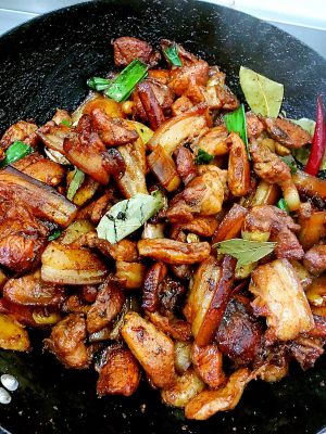 将五花肉用葱姜蒜,花椒,大料,桂皮等调味品煮熟,然后在高温的油锅里炸制上色,改刀切成小丁备用。