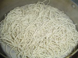 水开后,将面下入平底锅中煮熟后捞出过一下冰水(控干水分后将熟油淋在面条上,不时用筷子抖匀,可同时用风扇吹着)