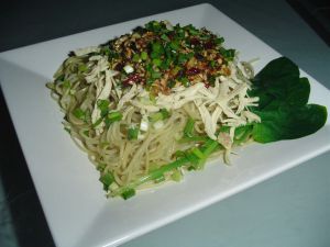 .把鸡丝盖在面上,浇上调料,在放两根焯过水的菠菜叶就OK啦!!!哈哈~~~可惜家里没有豆芽,不然把豆芽铺在盘底,拌在凉面里真是相当经典呢!!!哈哈~~~