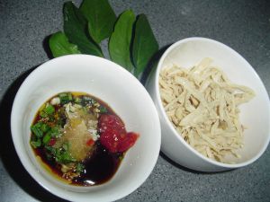 做鸡丝:一小块鸡胸肉煮熟,放冷后撕成鸡丝。(这个过程撕得我很痛苦。。。MD)