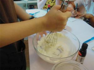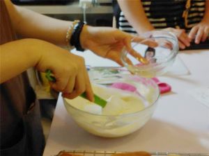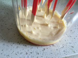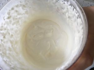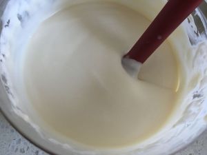 将盆隔冰水,不停地搅拌芝士混合液,至变稠即可:提起糊,滴落时不易快消失。