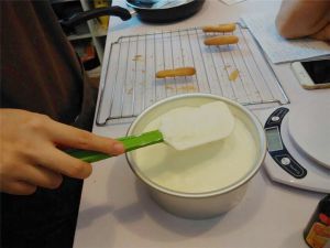 混合9的蛋黄糊、加入10的马斯卡彭奶酪搅拌均匀,加入11的淡奶油拌匀,倒入7的明胶,加入朗姆酒拌匀。奶酪糊就做好了。