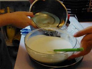 糖水煮沸后,慢慢加入到8的蛋黄糊里,搅拌均匀。