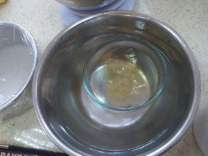 倒去水,取出吉利丁。放微波解冻1分钟(或隔热水溶化)。摇晃碗降温待凉。