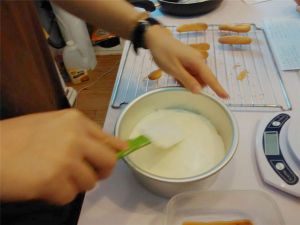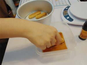 手指饼干浸入咖啡酒(或百利酒)后迅速取出。