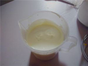 吉利丁加80ml水搅拌均匀,自然降温备用。