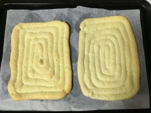蛋黄糊里面加入低筋面粉混合均匀,再分次加入到蛋白糊里面,混合均匀后装入裱花袋,在烤盘上按照模具形状挤好面糊。