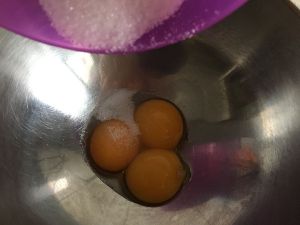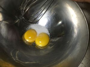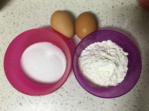 蛋黄和蛋白分离,蛋黄加10g糖打至发白。