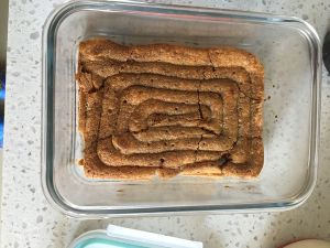 芝士糊倒入模中,中间再放一片刷了咖啡酒的手指饼.