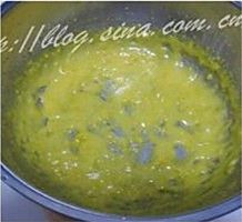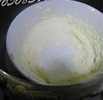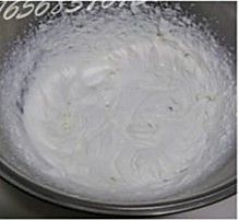 打发蛋黄的同时,熬制糖水,将100g糖放入少量水中,水烧开,糖融化即可!将糖水慢慢倒入打发好的蛋黄液中,要慢慢倒,一边倒一边搅拌,以免局部温度太高会烫熟蛋黄。。变蛋花汤。。哈哈。。水不要太多,这个步奏水多了,最后容易蛋糕脱模后坍塌。。不成型。。