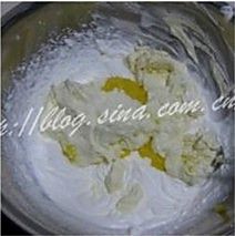 打发好的淡奶油全部倒入蛋黄奶油糊里,搅拌均匀。备用。