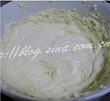 约三分之一蛋黄糊倒入马斯卡彭奶酪,翻拌均匀。