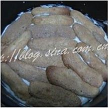 手指饼干铺均一层,将提拉米苏液倒入,抖动档案模子,让提拉米苏液均匀渗入,表面自然变平了,再铺一层手指饼干!