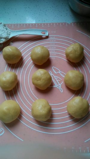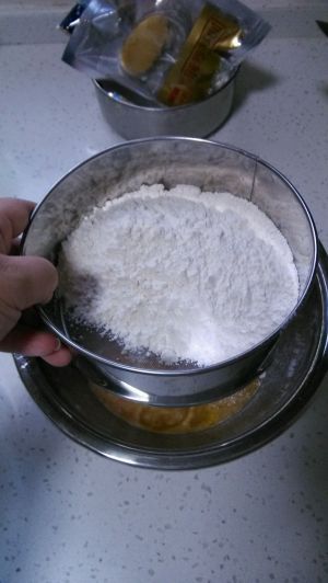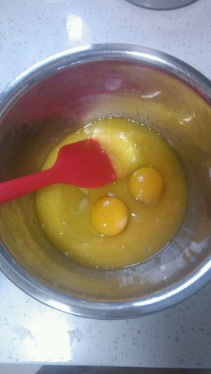 在煮糖水的过程中打发三个蛋黄至发白。糖水煮好后,起锅,一边用电动打蛋器打发蛋黄一边缓缓地倒入糖水(不要一次性倒入,会变蛋花汤的)。倒完后继续打发,此时蛋黄糊会从水状慢慢变得非常浓稠,出现纹路但纹路会缓慢消失,此时,蛋黄糊准备完毕。