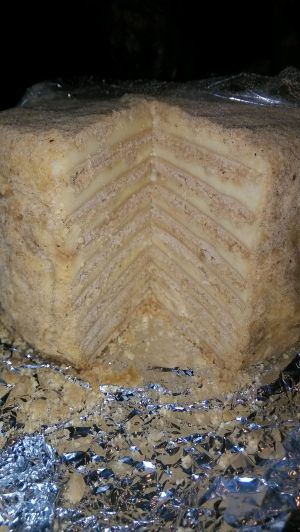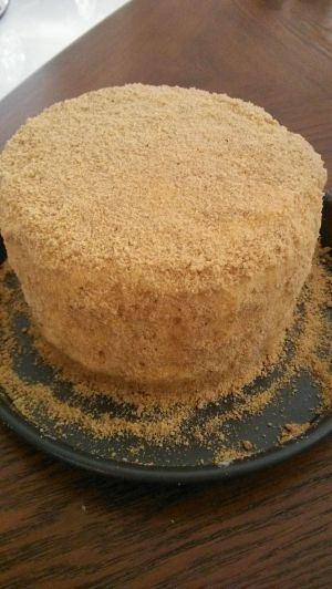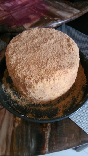 把蛋糕片和夹馅组合,一片蛋糕片抹一层夹馅,撒一层磨好的边角料和核桃仁的碎屑,直到第九层顶面。