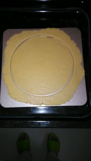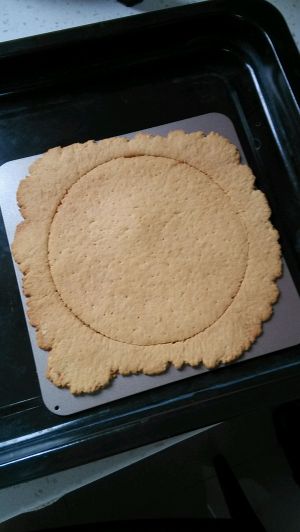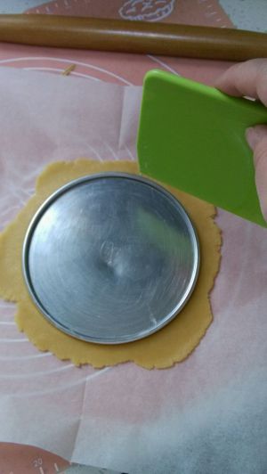 在油纸上把面团擀成面皮(大概3毫米左右厚),然后用6寸的活底蛋糕模具的底部压着,切割成圆形,多余的面皮不要动