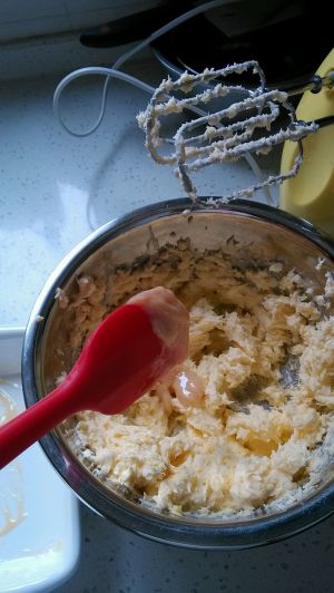 接下来做夹馅,常温软化的黄油和奶油奶酪混合搅打至顺滑,加入事先做好的炼奶焦糖酱,搅拌至蓬松即可。