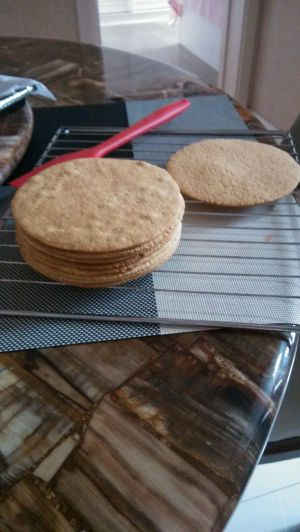 我家烤箱小,我是分了九次烤,然后晾凉(可以在蛋糕片不是太凉的时候,放入保鲜袋中,这样蛋糕片会湿润一些软一些,我没放,所以是脆的口感)。