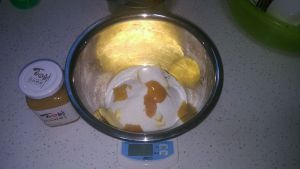 软化的黄油、糖、蜂蜜混合,隔水加热并搅拌至糖融化