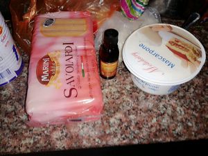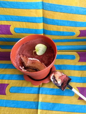 倒一点糊在六寸模具里,手指饼干沾咖啡酒放好,再到糊。最后一层糊轻轻晃动,放冰箱冷藏四小时后,面上撒些可可粉