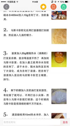 A. 饼皮 鸡蛋一个,糖15g,一撮盐,混合均匀。 加入速溶咖啡粉2g,香草精1g。