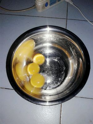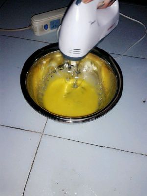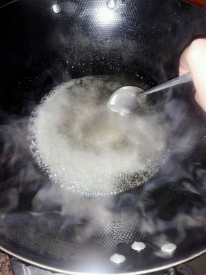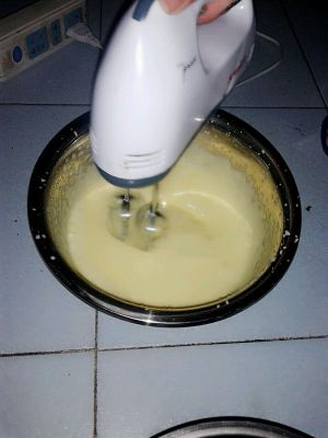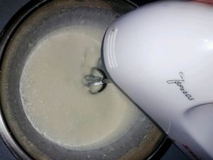白糖跟水倒入煮沸腾,慢慢的倒入蛋黄中,一边到一边搅拌。