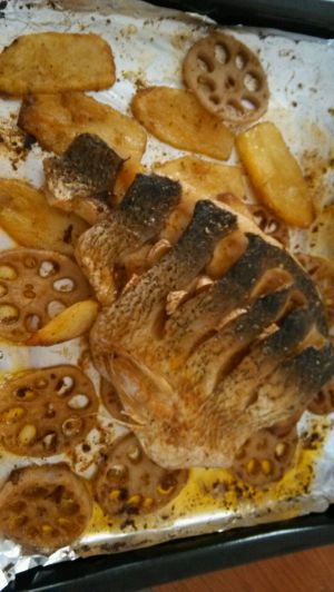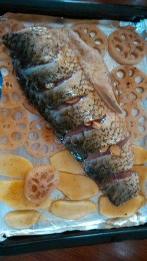 烤盘上铺一层锡伯纸,锡伯纸上放上土豆和藕片,再放上腌好的鱼,涂上一层料汁