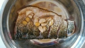 先把腌鱼调料都帮鱼按摩全身,腌制一个晚上时间,第二天吃之前从冰箱拿出来放烤盘中(注意为了防止锡纸破我垫了三层)