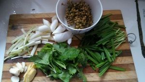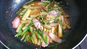 接下来土豆、藕、姜、蒜切片,韭菜、葱、芹菜切段,芹菜叶是最后出锅的时候用的,花椒也是泡菜坛子里抓出来的