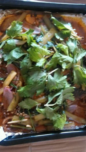 烤鱼的同时炒配菜,锅里放入适量玉米油,加葱、姜、蒜爆香,再加入适量火锅底料炒一会儿,加入泰式甜辣酱,黄瓜、芹菜段,炒好后加入适量水,再加入花椒烧开,黄瓜五成熟时加入洋葱煮一会儿,最后加入韭菜段,这时锅里的水分也收得差不多了,放入适量盐和鸡精调味