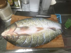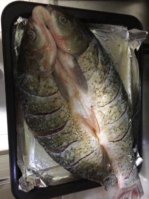 买的时候直接让店家处理好,告诉他是做烤鱼,他就会给你切成两片。洗净备用。