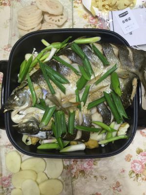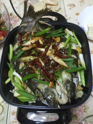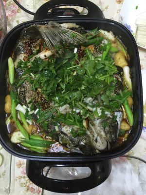 接下来就去把所有的配料放入电火锅,等烤鱼