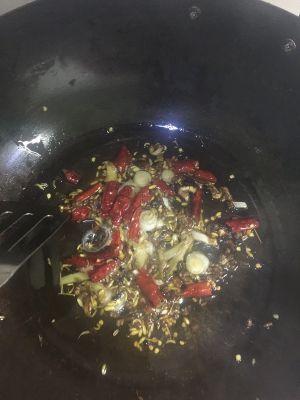 锅中放入1勺油,放入20克牛油欧国底料和1勺豆瓣酱小火煸出红油,放入葱姜蒜、干辣椒、花椒炒出香味
