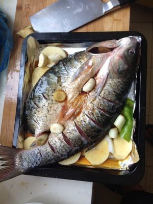 烤盘上先铺一层土豆片,然后将腌好的鱼放在上面,调料一起倒入,上面再放一层锡纸盖住~放入烤箱中,200度烤20分钟左右~