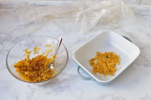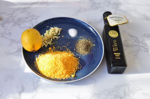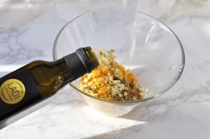 将面包糠,香草,盐,蒜末,胡椒粉放在一起,加入柠檬汁和橄榄油。