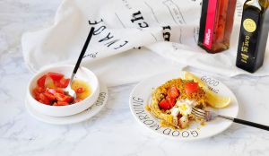 烤鱼的空当,将西红柿切成小块,加入调味酱汁中的黑胡椒,罗勒,橄榄油,红酒醋,盐调成酱汁。(西红柿1个 黑胡椒适量 罗勒3-4片 橄榄油1大勺 红酒醋2小勺 盐少许 )