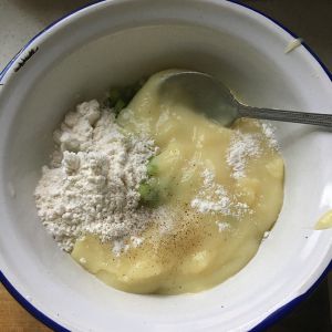 盆中加入土豆泥,面粉,芹菜,盐,胡椒粉搅拌均匀