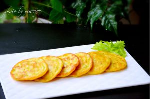 鸡蛋打散在碗里;将土豆小圆饼沾上蛋液;